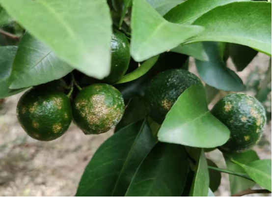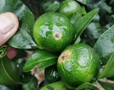油斑病直接原因是油胞破裂,滲出的油脂對果皮造成傷害。冰雹、日灼、風(fēng)傷等天氣因素造成油胞破裂,使用堿性農藥導致藥害,使油胞破裂。油胞多、油腺凸出的品種易感病。