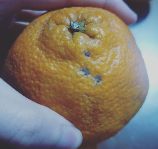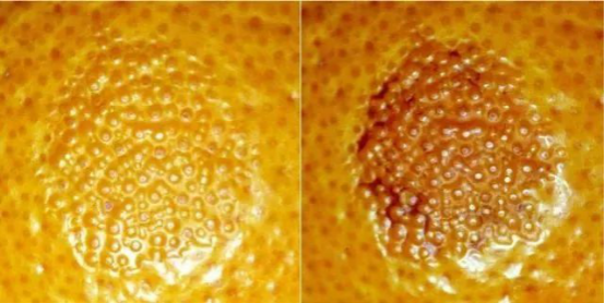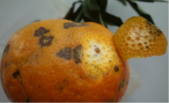 隨著(zhù)病情的發(fā)展,油胞逐漸萎縮,雖然該病不會(huì )繼續向下發(fā)展,但易被其他病原菌侵染,誘發(fā)炭疽病、青霉病等。