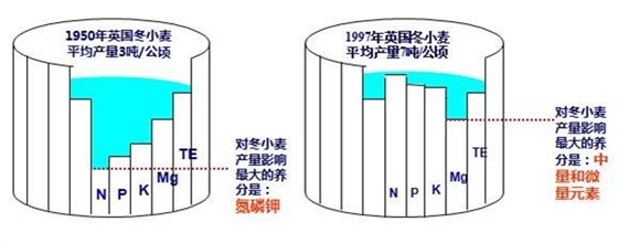 這下是不是清晰明了了?要增加作物產(chǎn)量,就要從最缺的元素來(lái)補充。以小麥為例,19世紀50年代,英國冬小麥的平均產(chǎn)量是3噸/公頃,經(jīng)過(guò)研究發(fā)現,對產(chǎn)量影響最大的養分是氮磷鉀,于是農民開(kāi)始大量施用氮磷鉀復合肥,產(chǎn)量開(kāi)始逐步增加。到了19世紀末的1997年,英國冬小麥的平均產(chǎn)量可以達到7噸/公頃,而這個(gè)時(shí)候發(fā)現再加大氮磷鉀的施用量,產(chǎn)量也不增加了,反而開(kāi)始減少。后來(lái)發(fā)現經(jīng)過(guò)幾十年的補充,氮磷鉀已經(jīng)完全不缺乏了,反而是缺乏中量和微量元素,比如鈣鎂硼鋅鐵銅等。