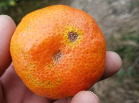 初期果皮出現形狀不規則的淺綠色或淡黃色的病斑,病斑內油胞顯著(zhù)突出,油胞間的組織稍凹陷。