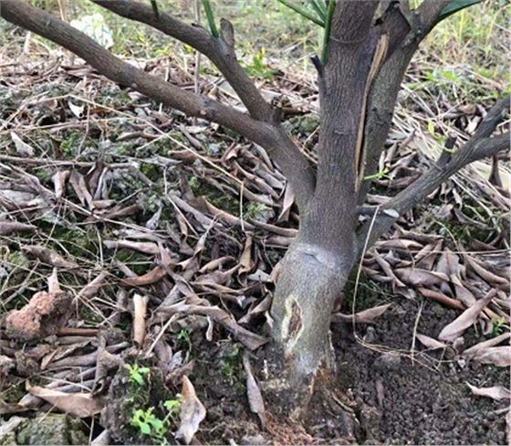 連續降大雨后,果園易積水,土壤含水量過(guò)高,導致土壤缺氧,果樹(shù)根部呼吸受阻,造成黃化、爛根。