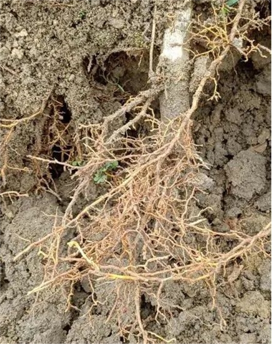 根瘤根系可繼續生長(cháng),其產(chǎn)生的側根繼續受侵染,如此一來(lái)根系受損嚴重,吸收肥水功能喪失,進(jìn)而導致地上部分葉片失去光澤黃化脫落,落果現象也出現,造成減產(chǎn),還會(huì )引發(fā)其他土傳病害,嚴重的時(shí)候還會(huì )整株死亡。