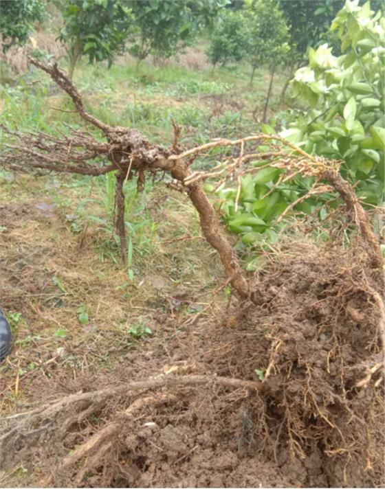 根結線(xiàn)蟲(chóng)為害柑橘根部,特別是側根、須根,造成根尖部位形成根瘤,根毛稀少,大小形狀不等,細根或側根明顯減少,初期根瘤為乳白色,后轉變成黑褐色;嚴重的時(shí)候須根扭曲并形成團餅狀,最后壞死。